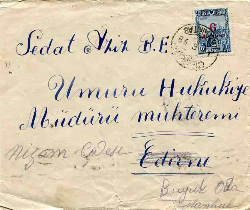 Turkey: 1929 (17 June). Redirected cover to Edirne franked with 6k and 10k of 1929 Latin Characters Surcharged stamp tied by GAZIAINTAB 3 (unrecorded by A&P) date stamp. Reverse 19.6 transit, 21.6 Edirne arrival and finally Prinkipo arrival cds’s. Isfila 1204
