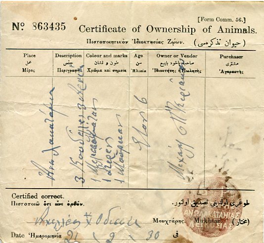 Cyprus: 1930 certificate of ownership of Animals struck by red-brown G.R. Anolaindas Mukhtar seal of Nicosia.