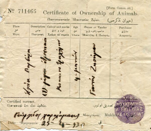 Cyprus: 1930 Certificate of Ownership of Animals struck by V.R. AYIA VARVARA of Nicosia Mukhtar seal.