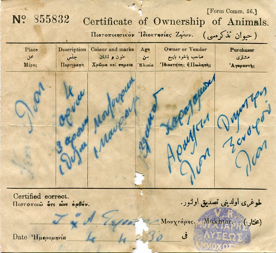 Cyprus: 1930 Certificate of Ownership of Animals struck by V.R. LYSSI of Famagusta Mukhtar seal.