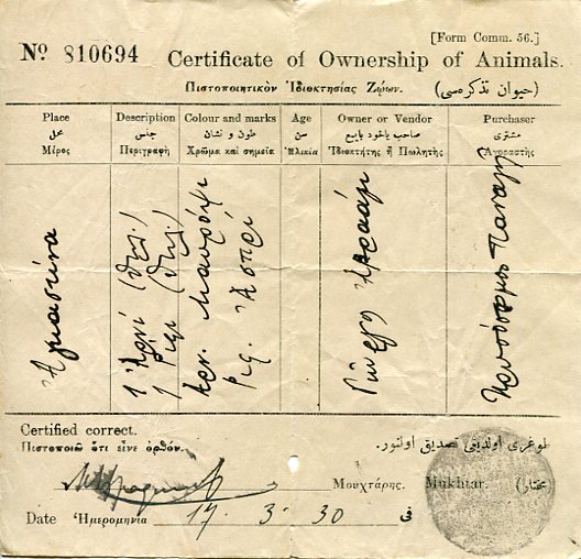 Cyprus: 1930 certificate of ownership of Animals struck by black village Mukhtar seal of Famagusta.