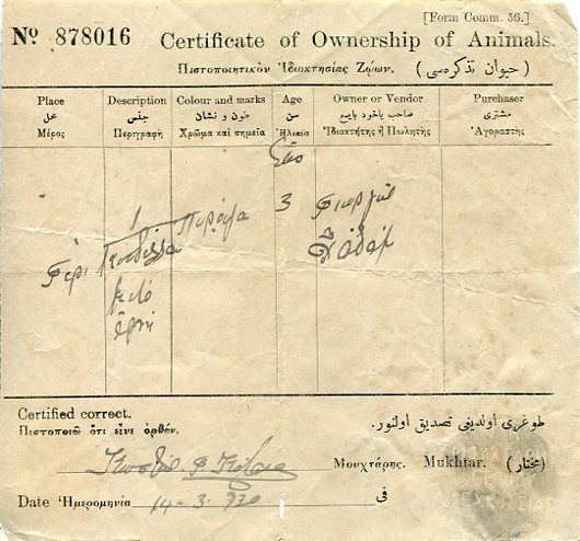 Cyprus: 1930 certificate of ownership of Animals struck by black V.R. Gourri Mukhtar seal of Nicosia.