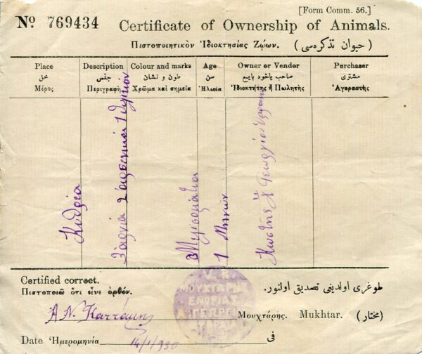 Cyprus: 1929 Certificate of Ownership of Animals struck by V.R. AYIOS YEORGIOS of Kyrenia Mukhtar seal.