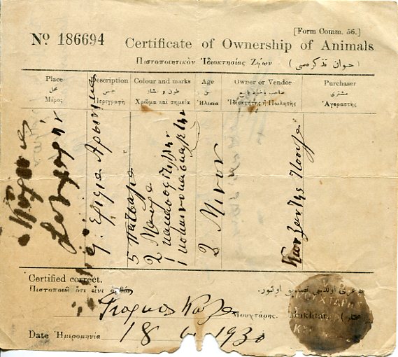 Cyprus: 1930 certificate of ownership of Animals struck by V.R. village Mukhtar seal of Kyrenia.