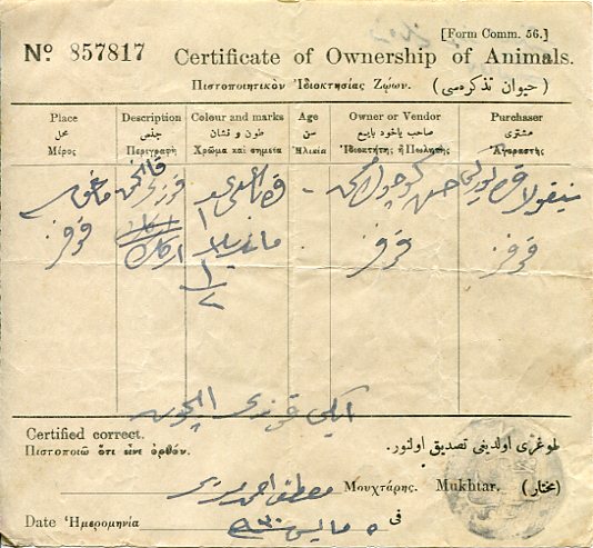 Cyprus: 1930 certificate of ownership of Animals struck by V.R. Lapathos Mukhtar seal of Nicosia in Ottoman Turkish.
