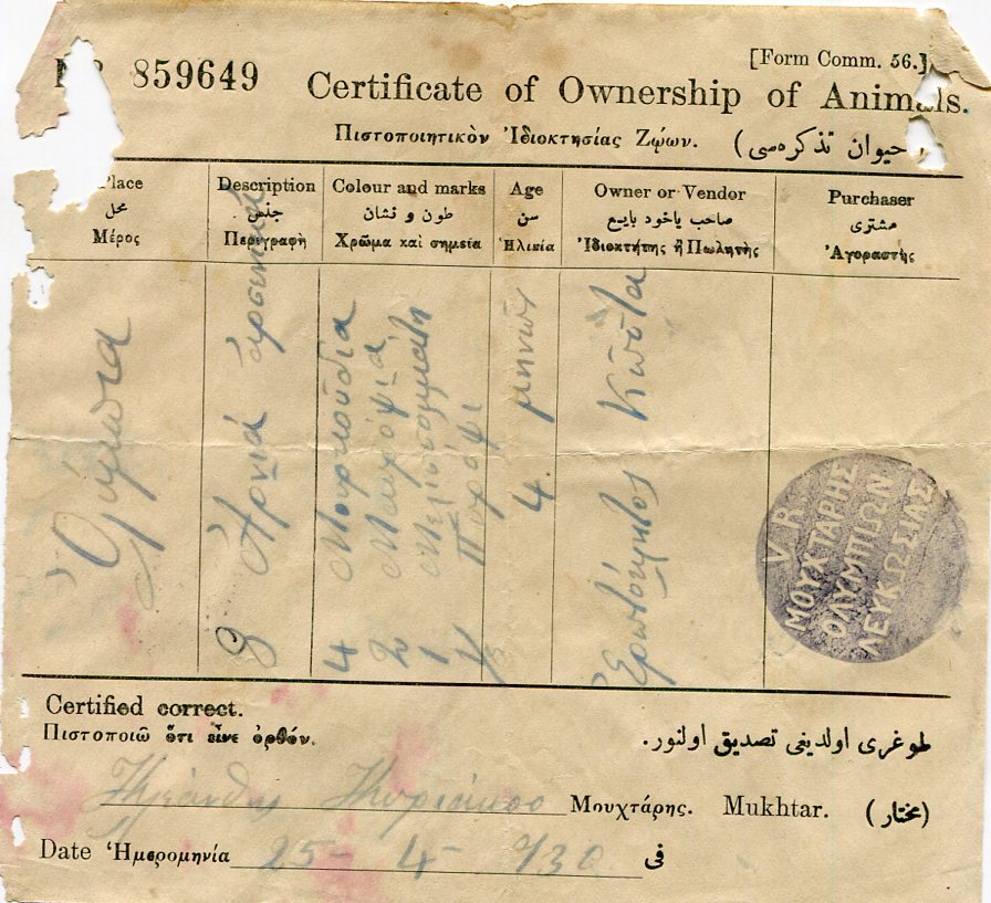 Cyprus: 1930 Certificate of Ownership of Animals struck by V.R. OLYMPIA of Larnaca Mukhtar seal.