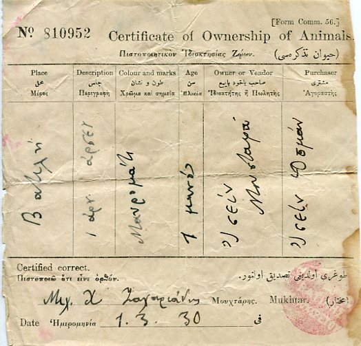 Cyprus: 1930 certificate of ownership of Animals struck by red V.R. Vatili Mukhtar seal of Famagusta.