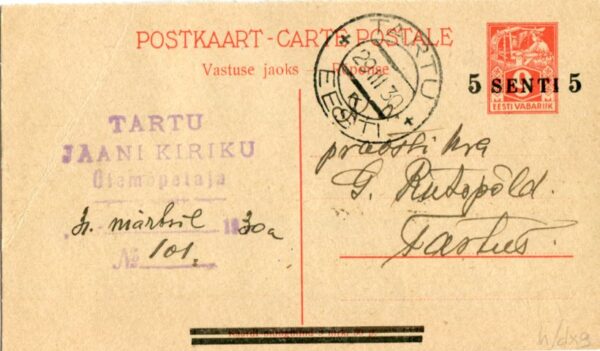 Estonia: 1930 (29 March). 5 Senti surcharged on 9Mk postal stationery card used locally struck by TARTU datestamps. Mi. P10II