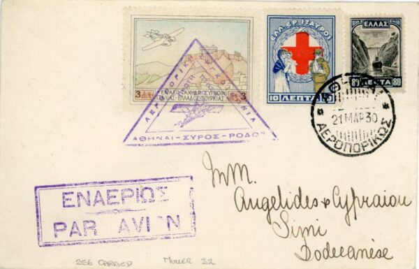 Greece: 1930 (March). Special flight cover from Athens to Simi franked with 3d. so called Patakonia, 80l. pictorial and 10l. Red Cross stamps tied by Athens datestamps. Reverse 21 March Rodi transit and 23 March cds’s. 236 flown. Muller 32
