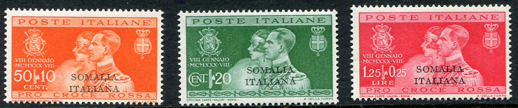 Somalia – Italian Occupation: 1930 (7 March). Marriage of Prince Humbert and Princess Marie Jose stamps of Italy overprinted “Somalia Italiana” mint o.g. Sg. 126/128. *