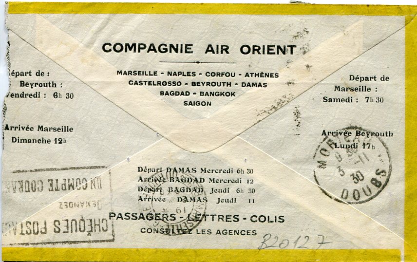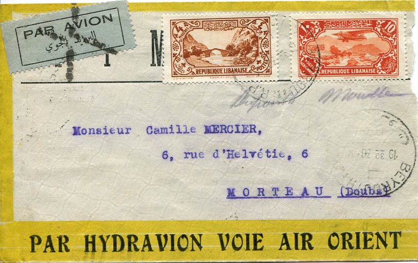 Lebanon: 1930 (30 October). Air Orient advertising cover to France franked with 4p pictorial and 10p airmail stamps tied by Beyrouth datestamps. Reverse 2 November Marseilles transit and next day Morteau Doubs arrival cds. Reduced on right. Sg. 171, 186