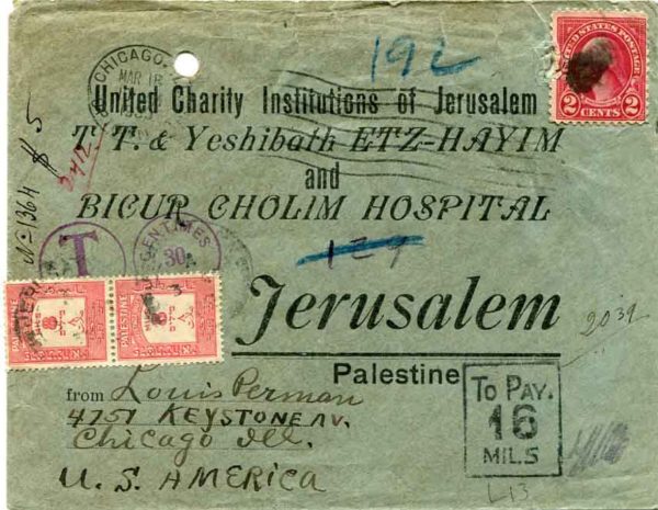 Palestine: 1930 (18 March). Cover from Chicago to Jerusalem franked with 2c United States stamp struck by violet T – CENTIMES 30 cachet and on arrival boxed TO PAY 16 MILS handstamp; franked with pair of 8m (Sg D16) postage due stamps and tied by JERUSALEM 3 April arrival cds’s. Couple of punch holes.