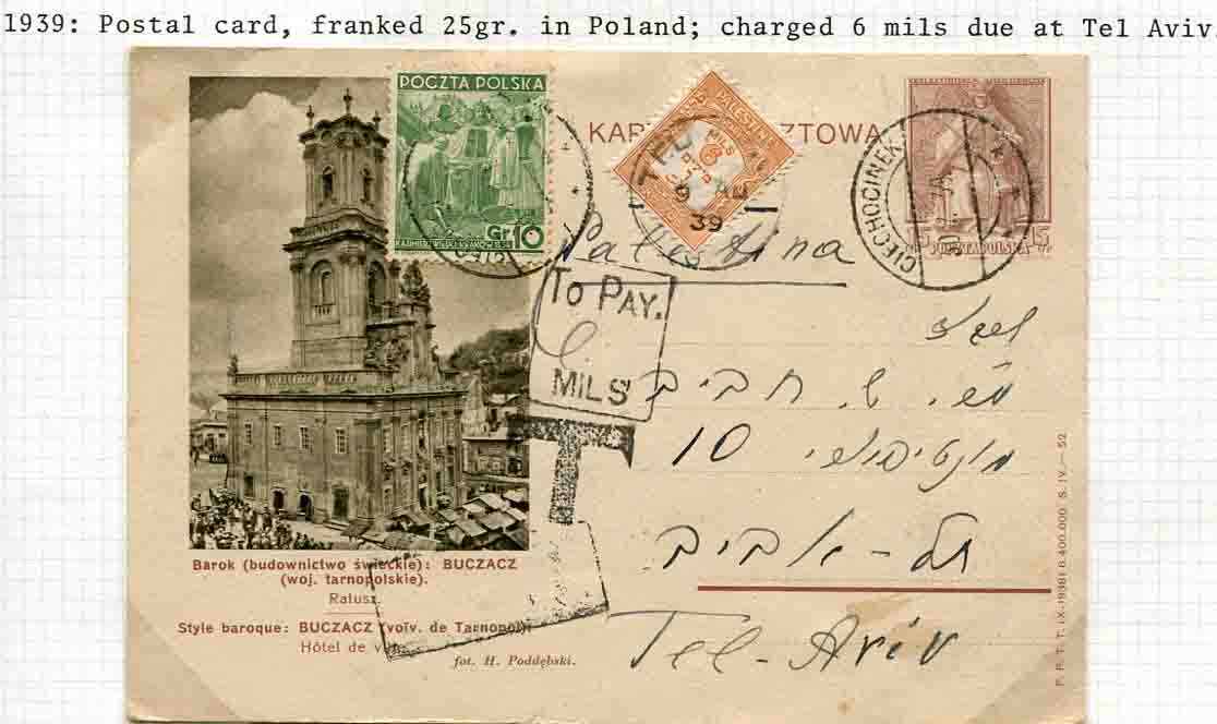 Palestine: 1939 uprated Polish postal stationery card to Tel Aviv charged 6m postage due on arrival.