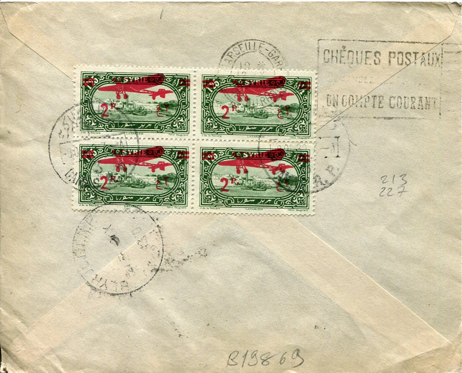 Syria: 1930 (9 June). Commercial cover to France franked with 4p surcharged on 0p25, single and a block of four 2p on 1p25 Aeroplane overprinted issue of 1929 stamps tied by Damas R.P. 3 datestamps. Reverse Beyrouth transit and 12 June Paris arrival cds’. Sg. 213, 227