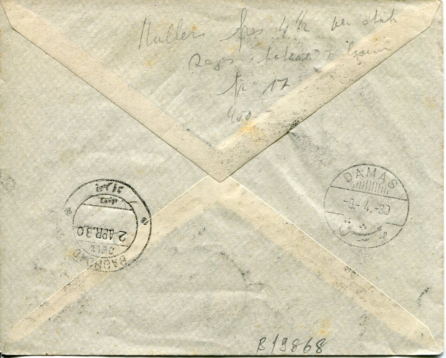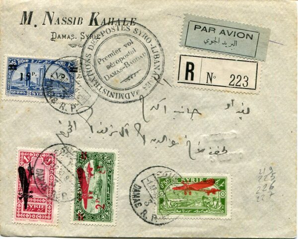 Syria: 1930 (1 April). M. Nassib Khale imprinted Damas Baghdad first flight registered cover franked with 15p surcharged on 25p, 0p50, 1p and 2p on 1p25 Aeroplane overprinted issue of 1929 stamps tied by Damas R.P. and commemorative flight cachet. Reverse 2 April Baghdad and when cover returned 8 April Damas arrival cds’s. Sg. 219, 225/227