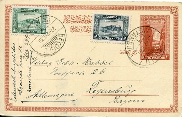 Turkey: 1930 (27 February). 3k postal stationery card additionally franked with 2k and 2 1/2 of 1929 Railway Line stamps to Germany tied by Beyoglu Istanbul 1 datestamps.