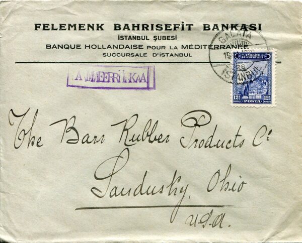 Türkiye: 1930 Dutch – Holland Mediterranean Bank Istanbul; branch cover to United States
