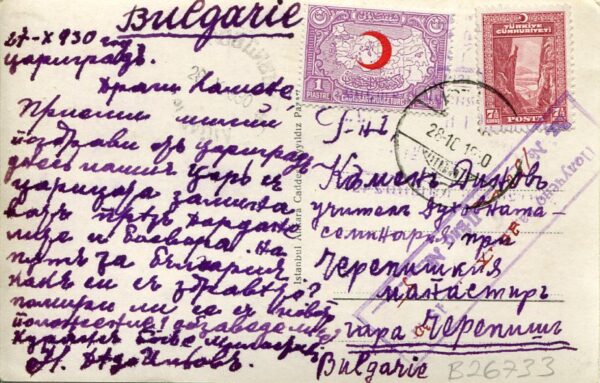 Türkiye: 1930 (28 October). Photocard of Galata Bridge, Istanbul to Bulgaria franked with 7 /2k pictorial and 1k Red Crescent obligatory tax stamp tied by dispatch datestamp, next day Plovdiv arrival cds and violet rectangular Bulgarian receiver hand cachet.