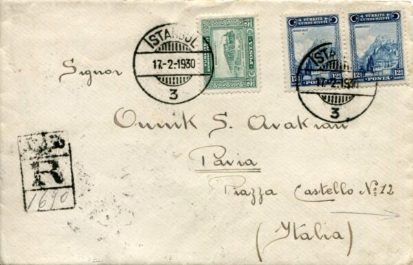 Turkey: 1930 (17 February). Registered cover addressed to an Armenian in Pavia, Italy franked with pair of 121/2k Ankara Castle, 2 1/2 Railway pictorial and on reverse block of four 10pa Grey Wolf pictorial stamps tied by Istanbul datestamps. Reverse 19 February Trieste transit and same day cds’s.
