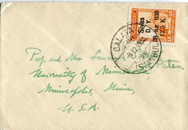 Turkey: 1930 (8 December). Greetings card cover to United States franked with 12,5k surcharged on 15k opening of Sivas Railway date overprinted stamp tied by Galata – Istanbul datestamp. Reverse no postal markings and sender’s address cut-out.