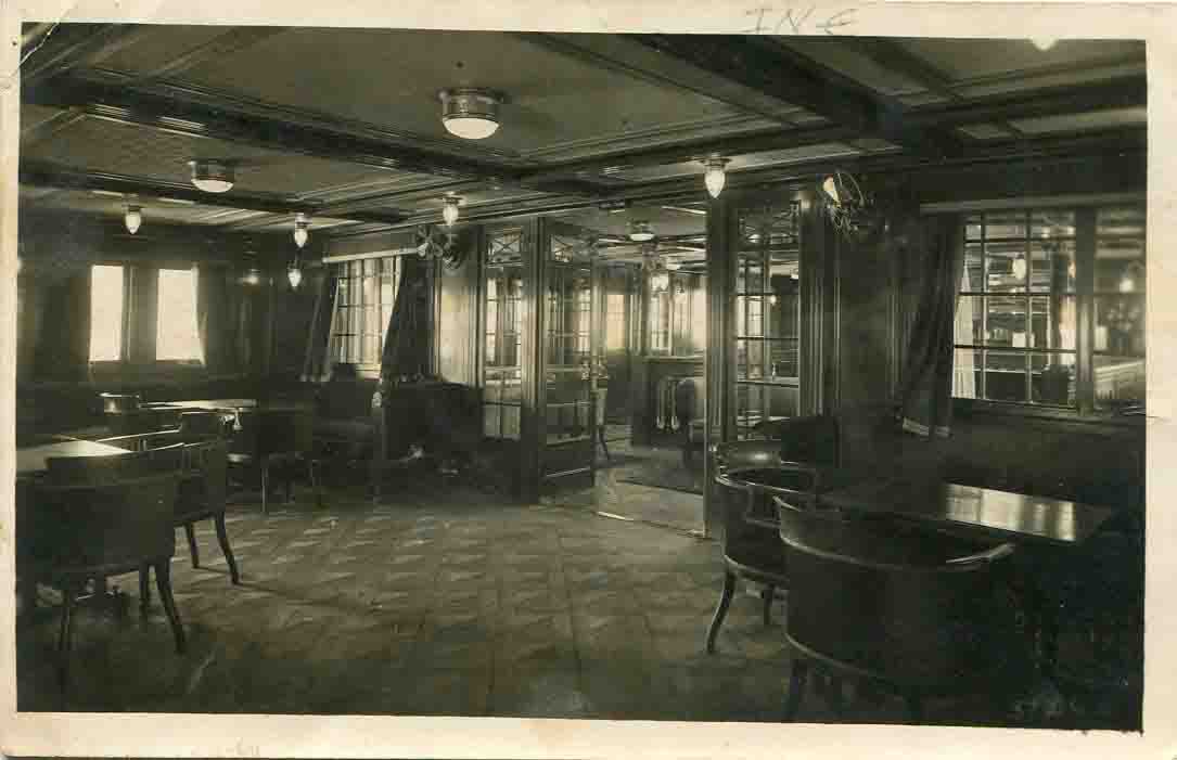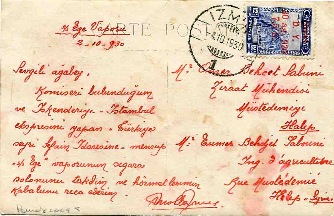 Turkey: 1930 (4 Oct). Photocard of the Smoking Room of the s/s EGE cruise ship franked on reverse with 7.5K on 12 1/2k of 1930 opening of Ankara – Sivas railway line surcharged commemorative stamp and tied by IZMIR 1 date stamp to Alep, Syria. Very unusual and scarce. Isfila 1244