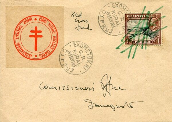 Cyprus: 1930s official cover to Famagusta Commissioner with Tuberculosis Society label franked with 1pi tied by EXOMETOKHI G.R. Rural Service cancellation. Reverse blank.
