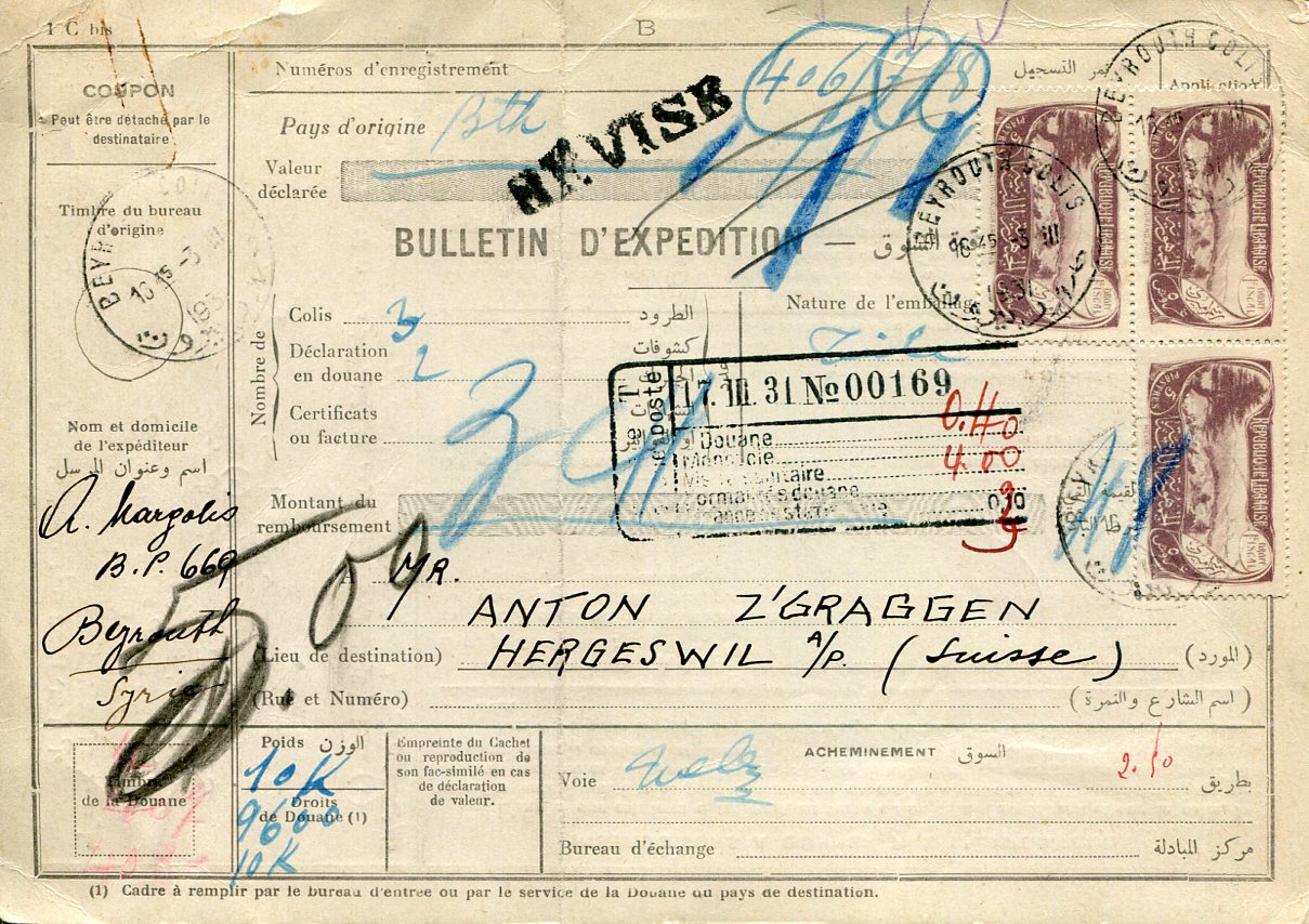 1931 Lebanon Parcel Card to Switzerland