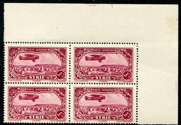 Syria: 1931 (January). Airmail issue 100p Potez 29-4 biplane over Telebisse unmounted mint right corner marginal block of four. Sg. 270