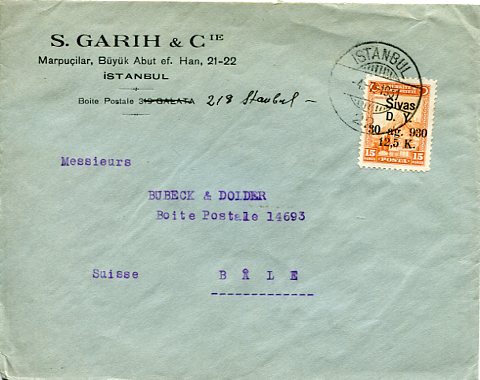 Ottoman Turkey: 1931 (4 July). Commercial cover to Switzerland franked with 12,5K Sivas Railway surcharged on 15k of 1930 pictorial issue tied by Istanbul datestamp. Reverse 8 July Basel arrival cds. Scarce single franking.