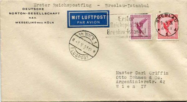 Turkey: 1931 (1 May). Breslau – Istanbul first flight cover via Vienna. Muller 446