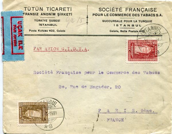 Turkey: 1931 (18 June). Tobacco Company airmail cover by CIDNA to France franked with 7 1/2k and 25k of 1930 pictorials tied by Istanbul 8 datestamps. Reverse 20 June Paris and 24 June Gare Du Nord Avion cds’s.