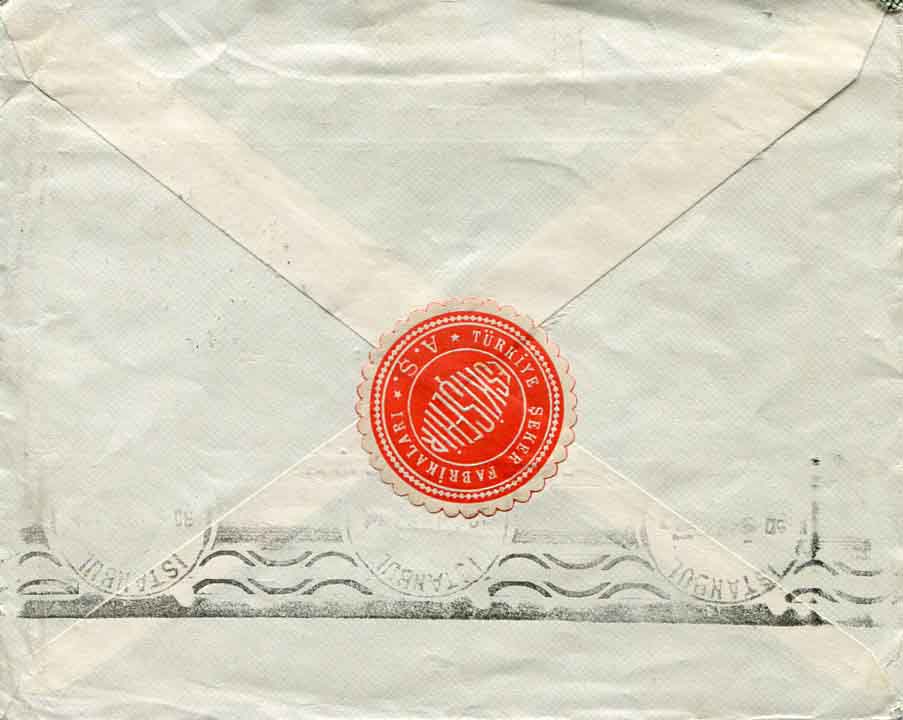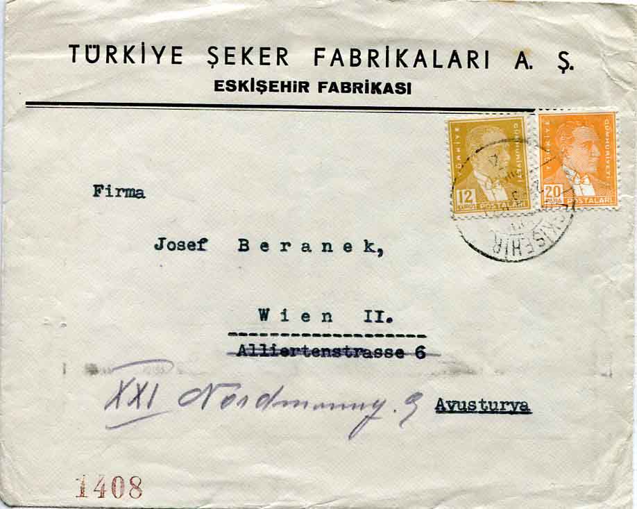 Turkey: 1931 Turkiye Seker Fabrikalari A.S. (Turkish Sugar Factory Co.) headed cover to Austria franked with 20pa and 12k Ataturk definitives and tied by ESKISEHIR datestamp. Reverse Istanbul transit cds. and factory’s label.