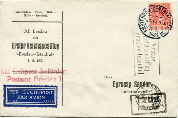 Turkey: 1931 (29 April). First Flight between Breslau and Istanbul cover from Amsterdam by train to Breslau receibed 1 May first flight datestamp and on reverse Istanbul 2 May arrival cds. Returned to sender with black IADE / Retour handstamp. Muller 447