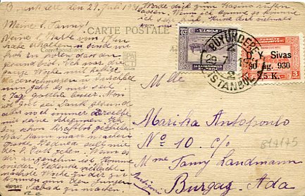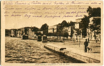 Turkey: 1931 (29 July). Picture postcard titled ‘Bosfhore – Büyükdere – Vue de Quai’ to Burgaz Ada (Ile Antigoni) franked with 20pa Ankara – Sivas Railway and 2,5k surcharged on 3k Sivas Railway overprinted stamps tied by Büyükdere datestamps and on reverse 30 July arrival cds.