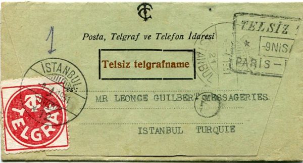 Turkey: 1931 (9 April). Complete radio telegraph (also known wireless telegraphy) form from Paris to Istanbul affixed by Telgraf label and tied by datestamp.