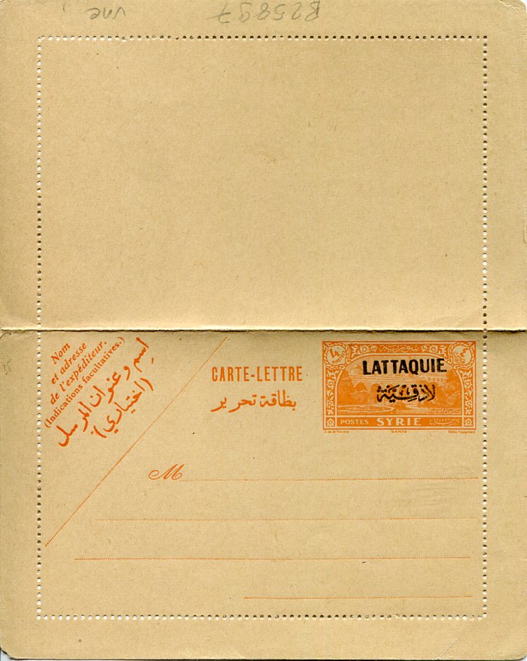 Syria – Latakia: circa 1931 unused Lattaquie overprinted 4pi Syrian lettercard.