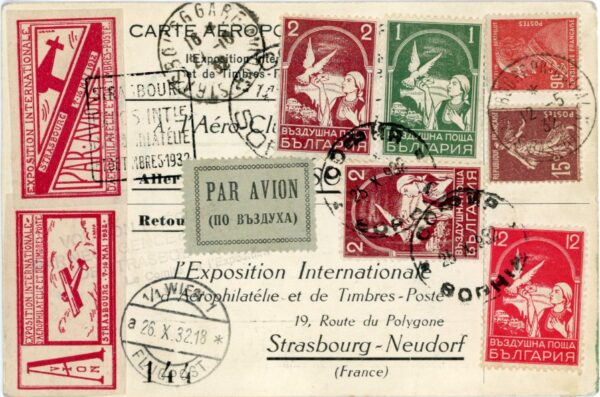 Bulgaria: 1932 (25 October). International Aerophilately Exhibition, Strasbourg formular card from Sofia to Strasbourg franked with Bulgarian airmail and French stamps as well as two Exhibition label tied by Sophia datestamps, Vienna transit and arrival cds’s.