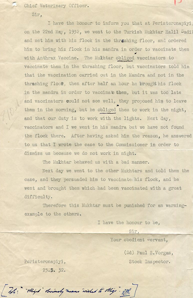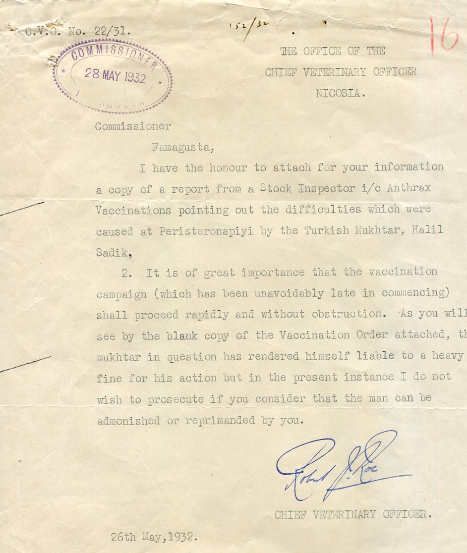 Cyprus: 1932 two pages document from the Veterinary Office, Nicosia regarding Anthrax Vaccination for livestock