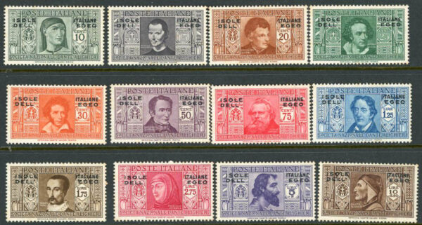 Greece – Dodecanese Islands – Italian Occupation: 1932 (May-November). Italian Dante Issue overprinted mint o.g. set. All values with yellow spots. Spacefiller. Sg. 70/81 *1932 Dodecanese overprinted on Dante Set *