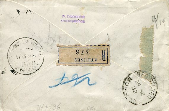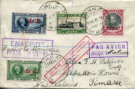 Greece: 1932 (23 September). Airmail cover to New Zealand via Imperial Airway Nairobi – Dar Es Salam, followed by Mombasa and then by sea to Timaru franked with surcharged issue of 1932 and 15l pictorial tied by Athens datestamps and struck by handcachets. Only 56 flown