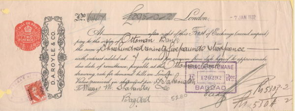 Iraq: 1932 banking document franked with REVENUE overprinted 2a of King Faisal I postage stamps of Iraq. Ross & Powell 124