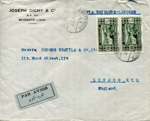 Lebanon: 1932 (8 April). Cover flown by Air Orient imprinted Joseph Dichy & Co to England franked with pair of 10p pictorials tied by Beyrouth datestamps. Reverse 11 April Paris Gare du Nord Avion cds. Sg. 176