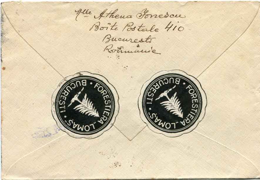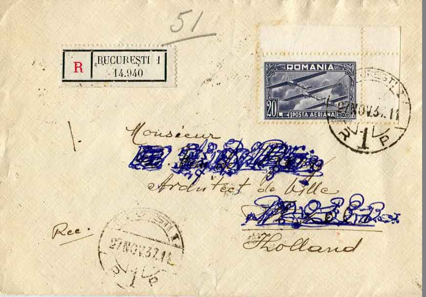 Romania: 1932 (20 November). Registered airmail cover to Holland franked with corner marginal 20l airmail stamp of 1931 and tied by Bucuresti datestamps. Reverse FORESTIERA * LOMAS * BUCURESTI Forestry labels.