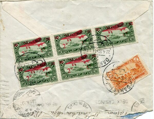 Syria: 1932 (22 April). Cover flown by Air Orient Syrie-Indochine line addressed to Hospital Berck Place, France franked with 4p pictorial and block of five 2p rd aeroplane surcharged 1p25 airmail stamps tied by Damas R.P. 2 datestamps. Reverse next day Beyrouth transit and 27 April Pas de Calais arrival cds’s.