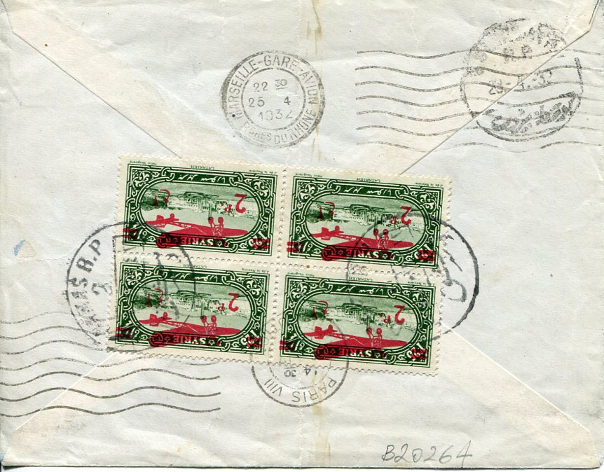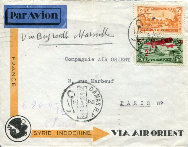 Syria: 1932 (23 April). Air Orient printed cover to France franked with 4k pictorial and five (block of four on reverse) red aeroplane overprinted 2p surcharged on 1p25 of 1929 issue airmail stamps tied by Damas R.P. 2 datestamps. Reverse same day Beirut and 25 April Marseilles Gare Avion trnsit and next day Paris arrival cds’s. Sg. 227, 252