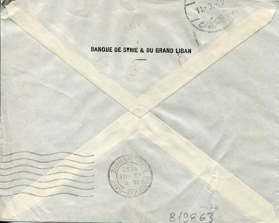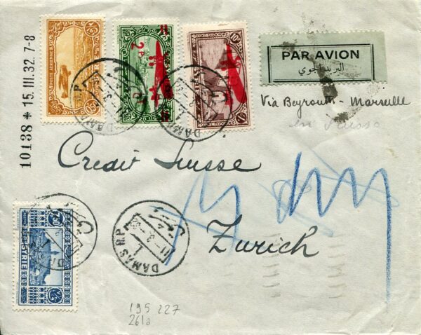 Syria: 1932 (11 March). Airmail bank cover to Zurich, Switzerland inscribed ‘via Beyrouth – Marseille’ franked with 10p aeroplane overprinted, 2p aeroplane surcharged on 1p25, 7p50 pictorial and 0p50 airmail stamps tied by Damas datestamps. Reverse same day part and 13 March Marseille-Gare transit cds’s. Sg. 195, 227, 255, 261