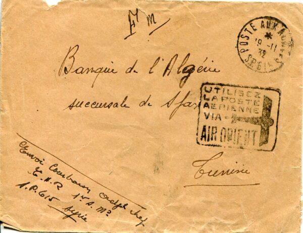 Syria: 1932 (19 November). Air France soldier cover free from franking to Tunisia struck by Poste aux Armees 615 (located in Latakia) datestamp and airmail propaganda cachet.