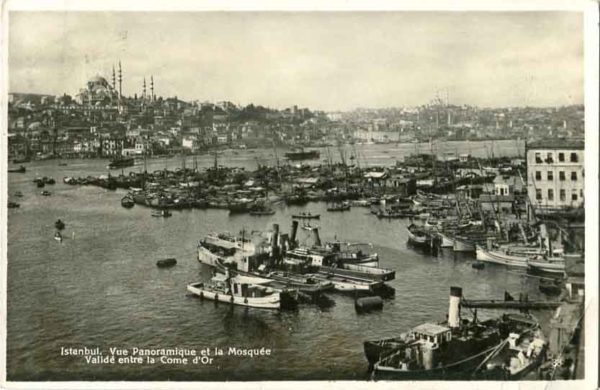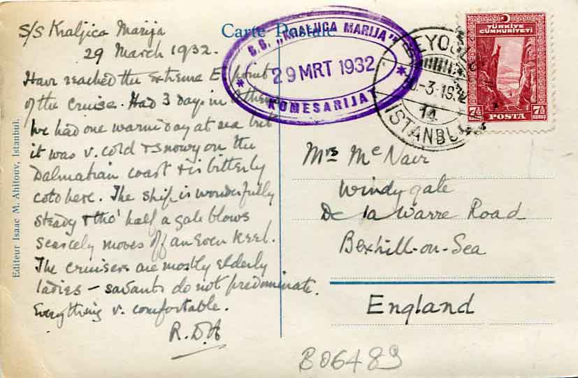 Turkey: 1932 (29 March). Photocard of Istanbul to England franked with 7 1/2k pictorial ant tied by dispatch cds and ‘S.S “KRALIICA MARIJA ” * KOMESARIJAT’ oval ship cancel.