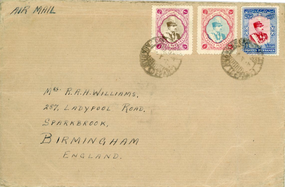 Iran: circa 1932 cover to Birmingham, England franked with 3ch., 1kr., and 1to. (damaged) Riza Shah Pahlavi portrait stamps Abadan datestamps. Reverse no postal markings.