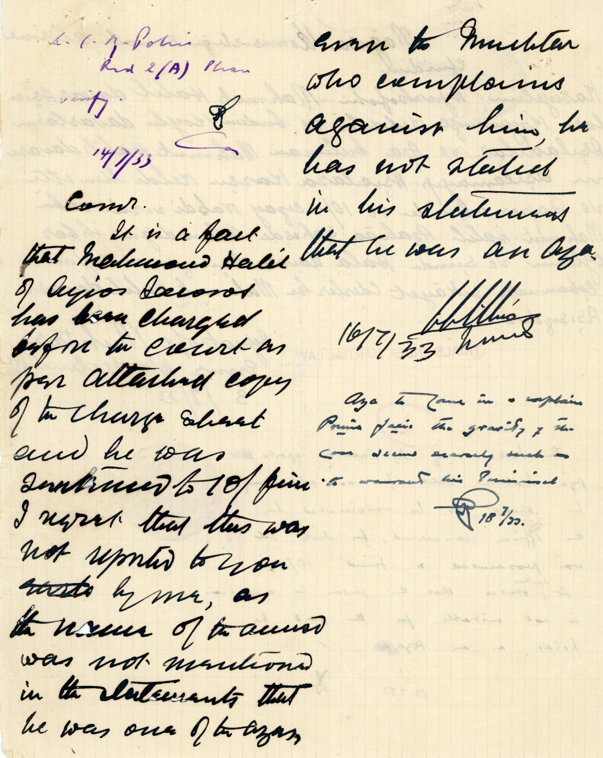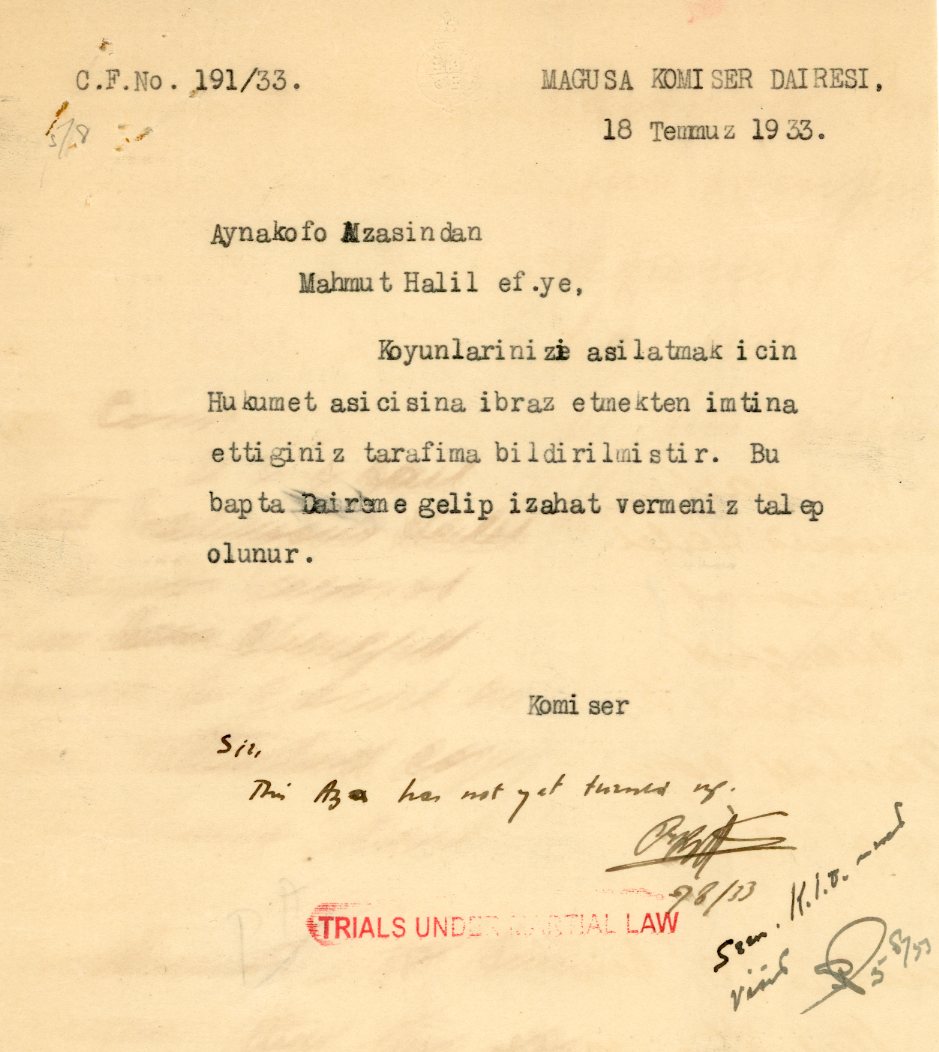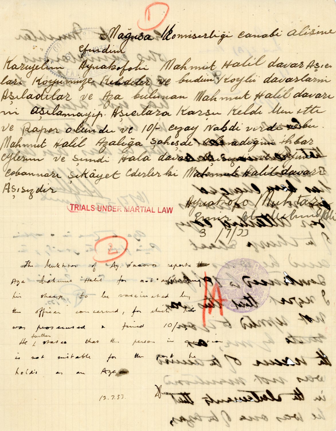 Cyprus: 1933 three pages Military Police document from Aynakofo (Agios Iakovos) struck by Trials Under Martial Law and Provost Marshal Court handcachets. Also V.A. Mukhtar Seal in Ottoman Turkish